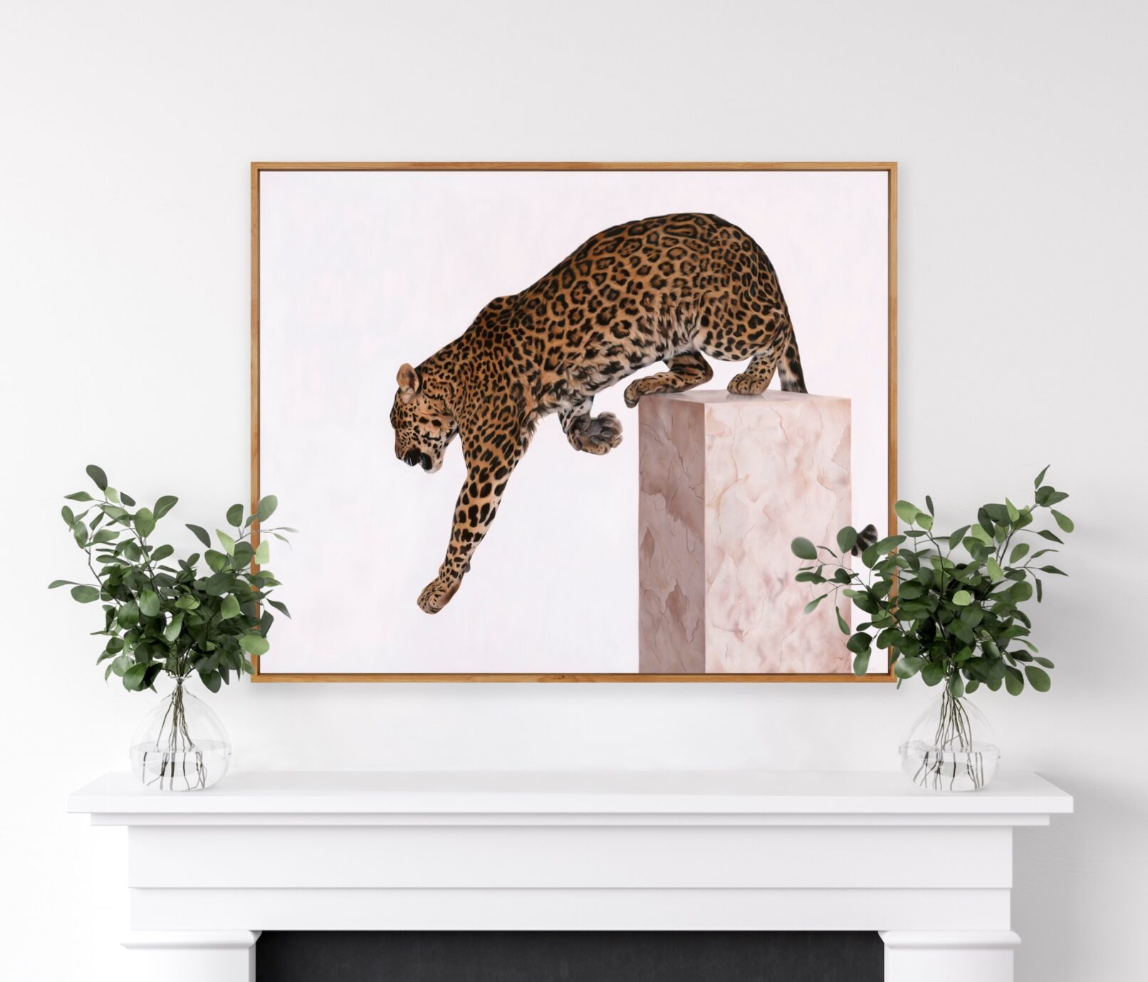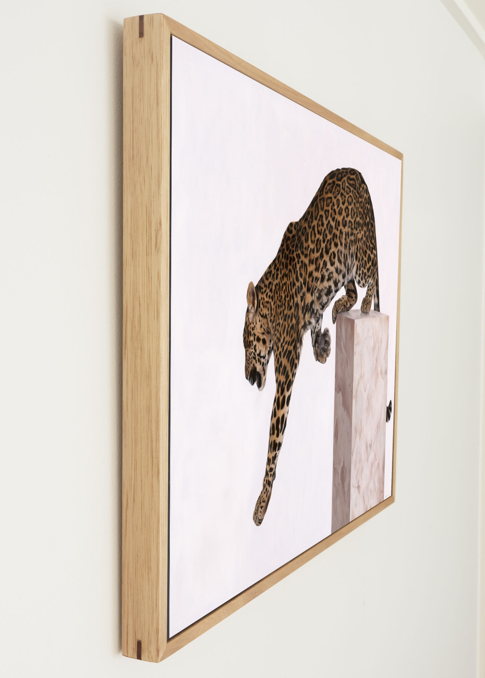 The artwork is framed in a handcrafted Tasmanian Oak Frame with decorative Red Cedar corner splines to compliment the colouring of the Leopard.